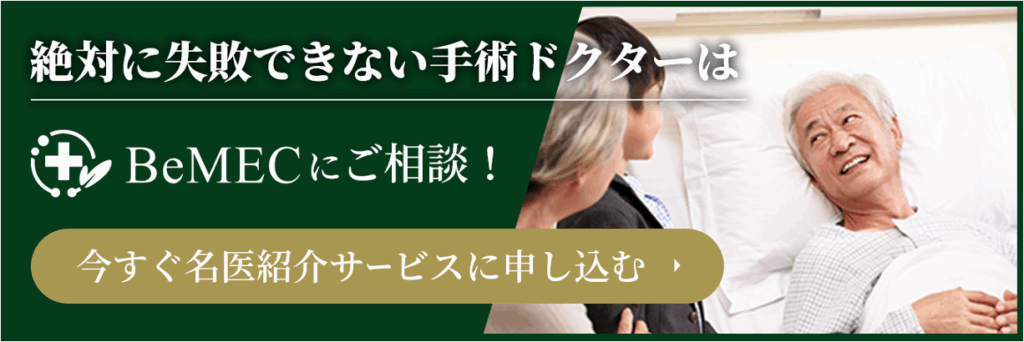 現在の治療が今のままで良いのか不安に感じている方や、信頼できる医師に治療をお願いしたいと考えている方は、ぜひBeMECの名医(スーパードクター)紹介サービスへご相談ください。