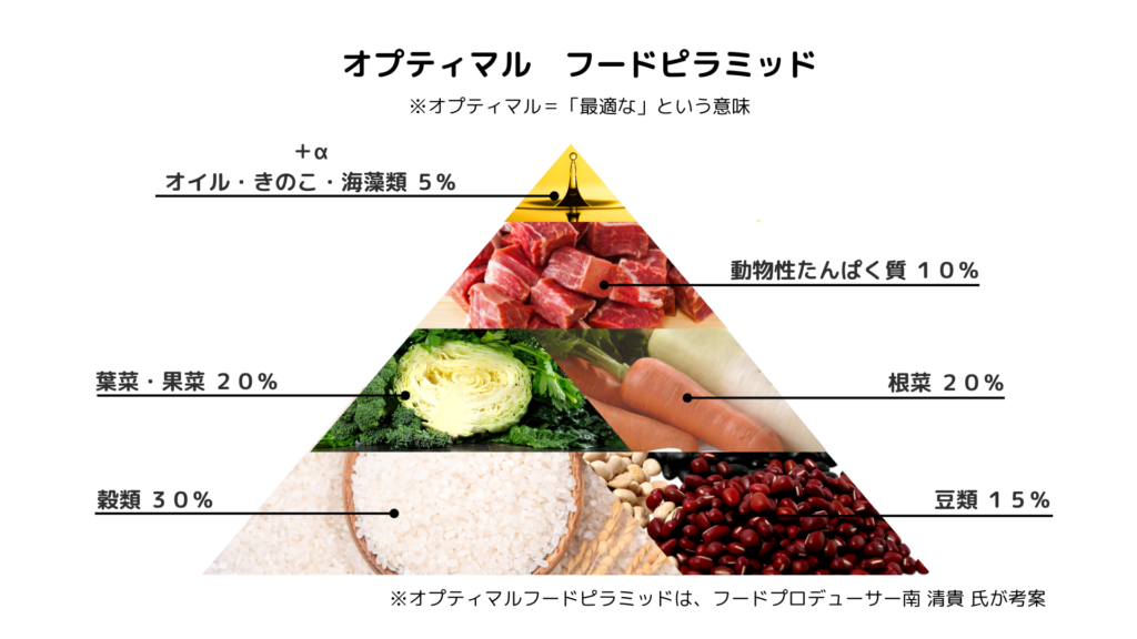 下の図『オプティマルフードピラミッド』の食事バランスを意識してみてください。